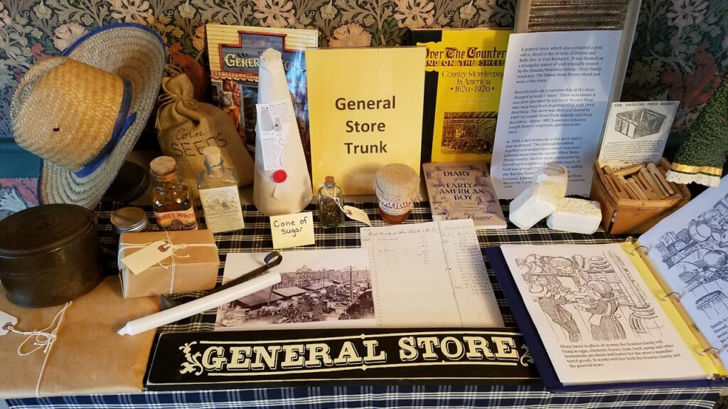 The general store was an essential part of pioneer life. Items that could not be homemade might be purchased or ordered through a local general store. Items could even be traded there; the early post offices also often operated out of general stores. This trunk gives samples of replica items one might find there or bring there to trade.