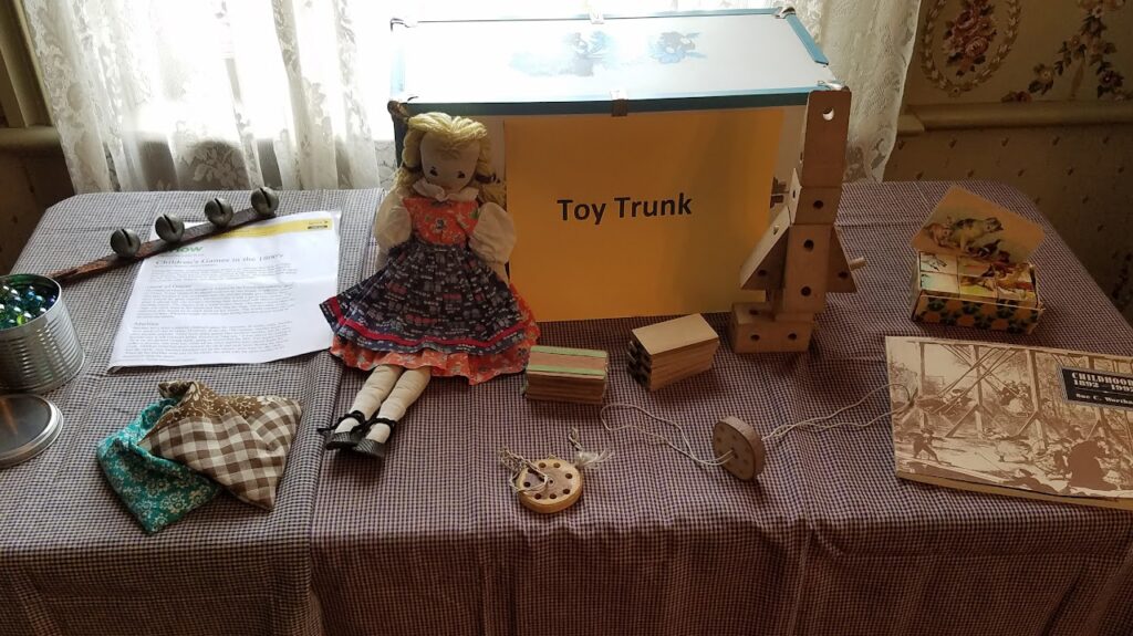 Children have always wanted to be entertained. This trunk shows how children spent their free time during the pioneer days, through dolls, puzzles, blocks, and other amusements that could occupy the imaginations of the young and the old.