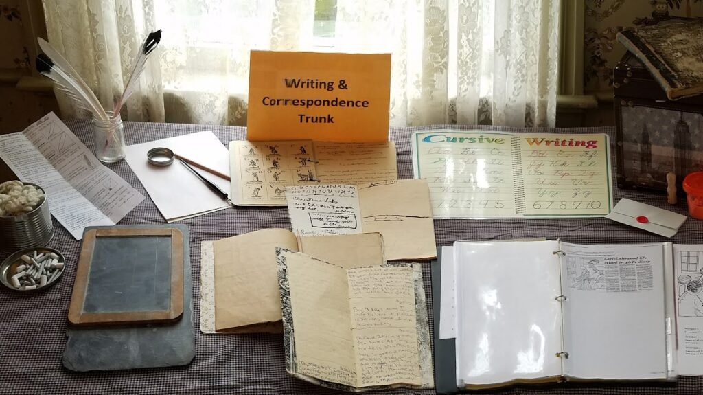 Writing is becoming a lost art, so this trunk celebrates writing, journals, cursive, and the evolution of the postal service in Lakewood. It includes diary pages from Miss Emma Beach, a member of a founding family in Lakewood.